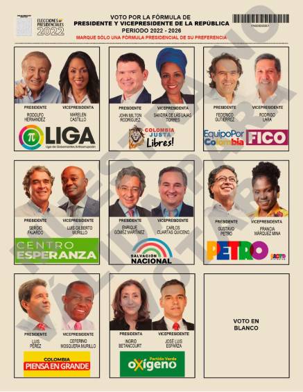 En esta primera vuelta electoral, los ciudadanos podrán votar por cualquier candidato de los ocho que se presentan. Solo si el ganador obtiene más del 50 % de los apoyos, objetivo muy improbable, obtendrá la presidencia sin necesidad de volver a acudir a las urnas. En caso contrario, los dos con mayor número de votos pasarán a unos segundos comicios para decidir definitivamente al nuevo presidente de Colombia.